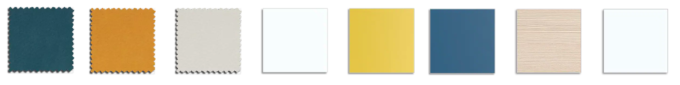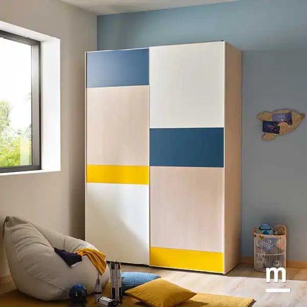 Динамичный дизайн шкафа-купе с раздвижными дверцами удивляет своей элегантностью. Двери состоят из четырех панелей разной ширины и отделки: светло-белый, горчичный и темно-синий. Можно создать индивидуальное решение для детской, подобрав отделку другого цвета. Большие двери обрамлены белым металлическим профилем со встроенной ручкой для более удобного открывания.